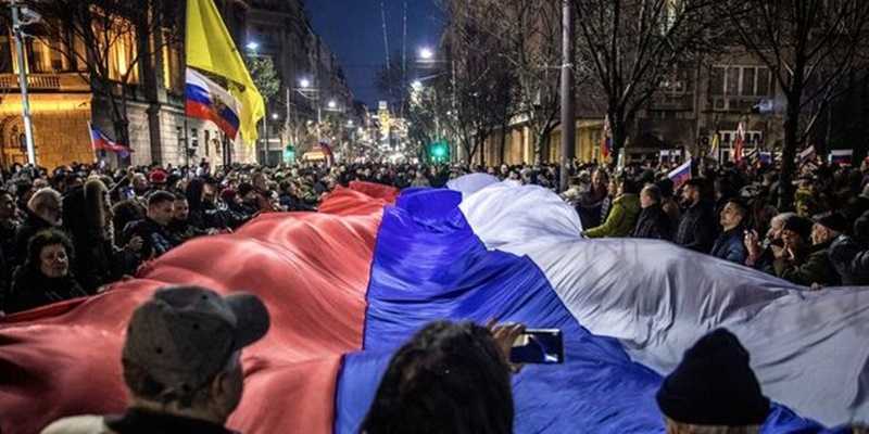 Para pengunjuk rasa berkumpul sekitar pukul 7 malam waktu setempat di monumen Nicholas II, kaisar terakhir Rusia, dan berbaris melalui pusat kota Beograd menuju Kedutaan Rusia. Iring-iringan itu terus meneriakkan: