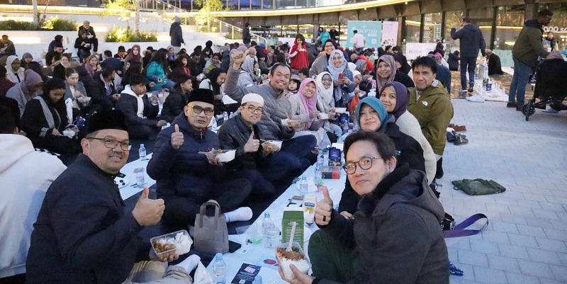 Ratusan warga Indonesia dan Inggris menyantap sejumlah makanan khan Indonesia, termasuk ayam bumbu Bali, oseng, rendang, pastel, onde-onde, risoler, dan kurma.