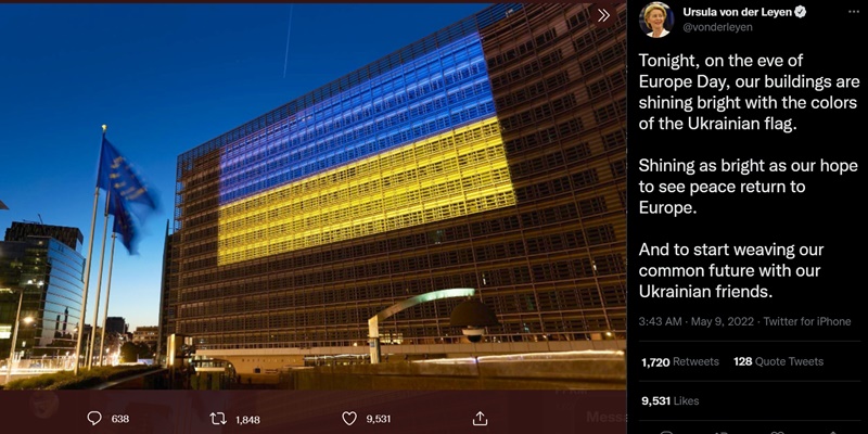 Uni Eropa akan menampilkan sosoknya yang lebih kuat lagi. Untuk memulai itu, dan bertepatan dengan Hari Kemenangan 9 Mei yang juga dirayakan di banyak negara di Eropa, Von der Leyen mengatakan bahwa gedung kantor Komisi Eropa pada Minggu malam (8/5) nampak terlihat semarak dengan sorot nyala lampu yang menggambarkan warna bendera Ukraina.