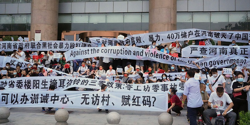 Aksir protes dilakukan oleh nasabah bank yang mengaku simpanan mereka telah dibekukan di empat cabang di Provinsi Henan. Hal itu membuat mereka kesulitan, terlebih dengan kebijakan penguncian Covid-19.
