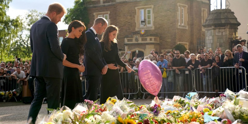 Berpakaian serba hitam, kedua pasangan ini tampak sedang melihat bunga-bunga yang diberikan untuk Ratu Elizabeth II yang mengembuskan napas terakhir pada Kamis (8/9) di usia 96 tahun.