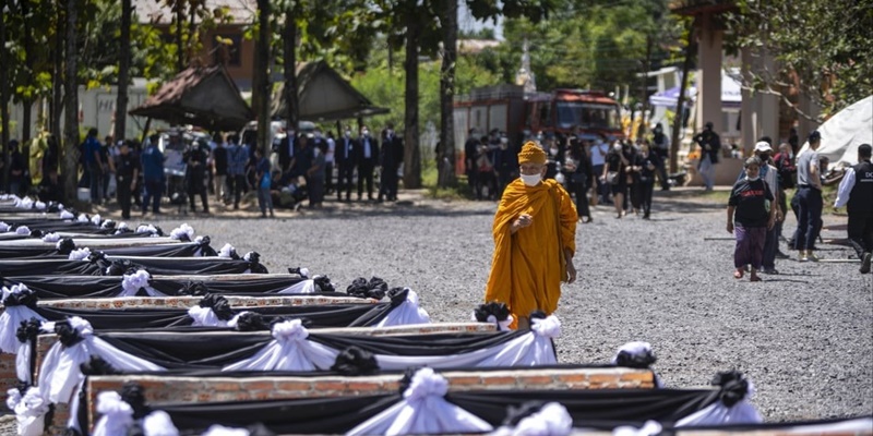 Bangkok Post melaporkan, di kuil Wat Rat Samakee di Na Klang, nyanyian para biksu memulai upacara ketika masyarakat pedesaan yang kelelahan dan berduka bersiap untuk mengucapkan selamat tinggal terakhir kepada 19 korban yang terbunuh.