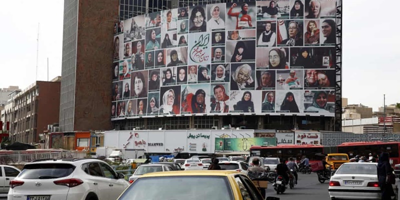 Papan reklame berisi 50 wanita Iran yang mengenakan jilbab, dikendalikan oleh Korps Pengawal Revolusi Islam. Di bawah gambar puluhan wanita itu, ada slogan; "Wanita di tanah saya"