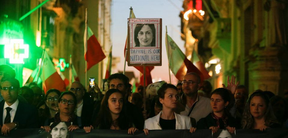 Reuters, para demonstran hadir dengan suasana haru sambil membawa foto Daphne dan mengibarkan bendera Malta.