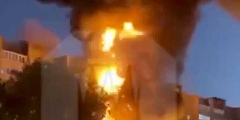 Rekaman di media sosial menunjukkan bola api besar meletus dari gedung sembilan lantai pada Senin.