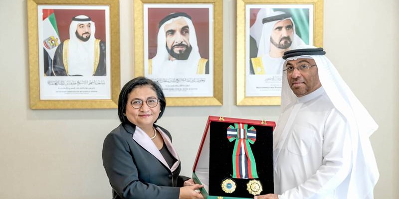 Menlu UEA Ahmed Al Sayegh, mempersembahkan Medal of Independence of the First Order kepada Hjayceelyn M Quintana, Duta Besar Filipina untuk UEA/Net