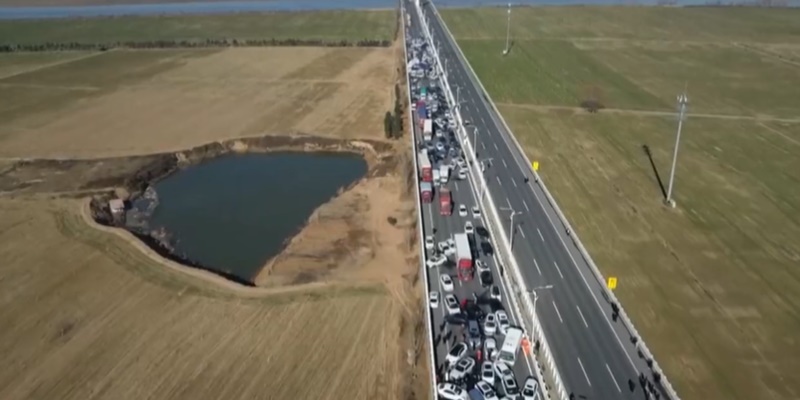 Dari foto dan video yang beredar di media sosial terlihat puluhan mobil dan truk menumpuk di Jembatan Zhengxin Huanghe, dengan beberapa orang tampak terjebak di dalam kendaraan.