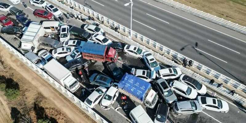 CCTV serta petugas penyelamat menyebutkan bahwa insiden tersebut disebabkan oleh kondisi cuaca yang sangat berkabut dan jalan yang tertutup es.