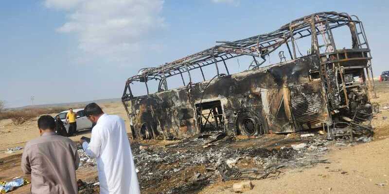 Tampak pada gambar bus dalam kondisi hangus terbakar dengan kerangka bagian atas dan jendela sudah tidak ada. Lokasi bus berada di pinggir jalan raya, di padang pasir dengan kondisi pepohonan sekitar yang gersang.