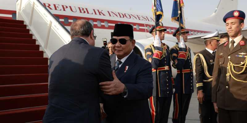El-Sisi tampak menjabat tangan dan memeluk Prabowo dengan erat sebelum presiden RI itu menaiki tangga pesawat.