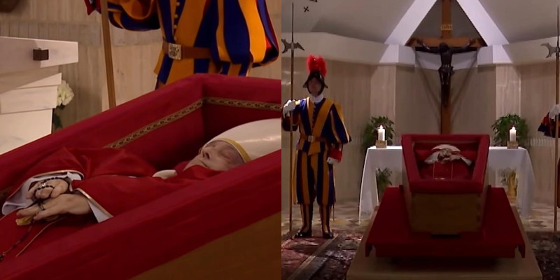 Jenazah Paus Fransiskus dijaga oleh dua pasukan Garda Swiss di sisi kanan dan kiri dekat letak kepala Paus Fransiskus.