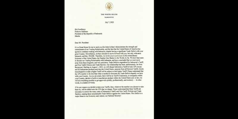 "Sayangnya, hubungan kita masih jauh dari timbal balik. Mulai 1 Agustus 2025, kami akan mengenakan tarif sebesar 32 persen kepada Indonesia atas semua produk Indonesia yang dikirim ke Amerika Serikat," bunyi surat tersebut.