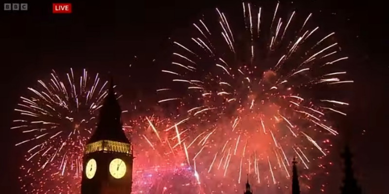 Tepat saat dentang ikonik Big Ben menandai pergantian tahun, kembang api ditembakkan dari tongkang di depan kincir raksasa tersebut. Setelah lonceng berhenti berdentang, alunan musik diputar, memadukan lagu-lagu populer sepanjang 2025 dengan kilas balik momen-momen penting Inggris selama setahun terakhir.
