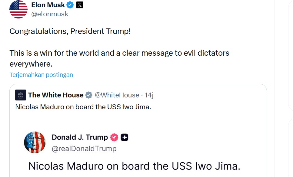 Musk mengomentari foto Nicolas Maduro yang diklaim di atas kapal USS Iwo Jima dengan tangan terborgol dan mata ditutup. Foto dan caption yang sama diupload akun X milik Donald Trump dan The White House.