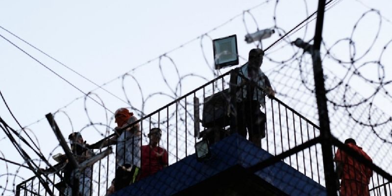Sejumlah narapidana terlihat menguasai menara patroli penjara. Sebagian mengenakan seragam tahanan, sementara lainnya memakai kaus tanpa lengan dan celana pendek, dengan wajah ditutupi kain yang diimprovisasi sebagai topeng.
