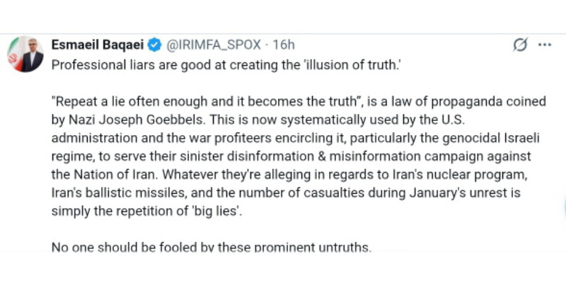 Baqaei mengutip prinsip propaganda Goebbels yang berbunyi, “Ulangi kebohongan cukup sering dan itu akan menjadi kebenaran,” dan menilai pola tersebut kini dipakai untuk menyebarkan disinformasi tentang Iran.