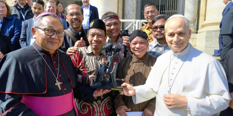 Patung tersebut merupakan hasil desain AM Putut Prabantoro, Founder Paguyuban Wartawan Katolik Indonesia (PWKI) yang diberikan kepada Paus Leo XIV oleh Stanislaus Jumar Sudiyana pada saat delegasi PWKI dan Konferensi Waligereja Indonesia (KWI) beraudiensi dengan Paus Leo di Lapangan St Petrus, Vatikan, pada Rabu 25 Maret 2026.