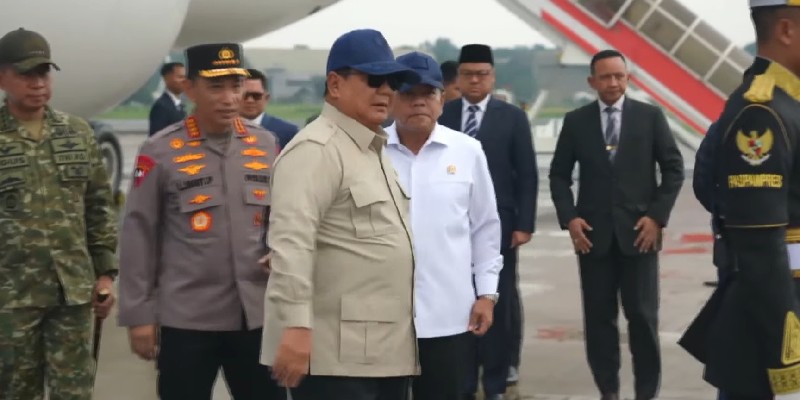 Dengan pakaian safari berwarna krem dipadu topi biru tua, Prabowo terlihat keluar dari pintu pesawat, kemudian menuruni tangga pesawat dan menyalami para pejabat negara yang telah menunggu di bawah.