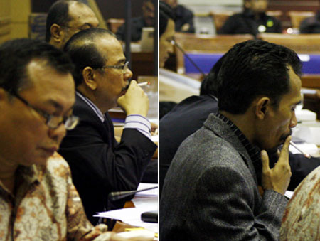 Kita tunggu, keampuhan larangan Bang Foke ini di gedung wakil rakyat. Apalagi, banyak wakil rakyat yang doyan merokok di dalam gedung, bahkan saat sidang. Dua foto ini sebagai buktinya. Dua anggota Komisi VIII DPR dengan santai merokok saat rapat kerja dengan Kementerian Sosial masih berlangsung. Sidang mengagendakan pembahasan penyesuaian Rencana Kerja dan Anggaran Kementerian/Lembaga. FOTO: MOHAMAD QOORI/RM