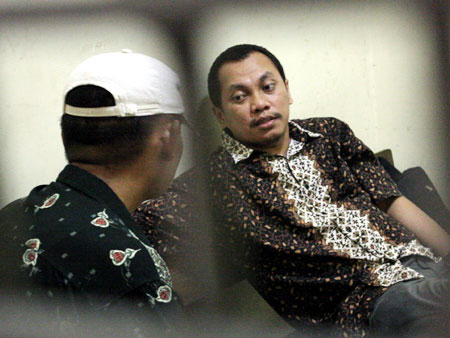 Terdakwa kasus mafia pajak Gayus H Tambunan tengah mengobrol santai di sel tahanan sebelum menjalani sidang di PN Jakarta Selatan, (Senin 29/11). Dalam sidang kali ini Jaksa penuntut Umum menghadirkan saksi Kepala Biro kantor Pusat hallo Bank Central Asia (BCA), Wani Sabu dan mendengarkan rekaman pembicaraan Gayus Tambunan dengan Satgas Pemberantasan Mafia hukum Hukum. YASIN HABIBI/ RM