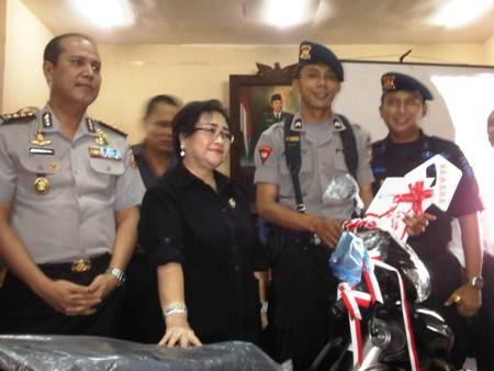 RMOL.Yayasan Univeristas Bung Karno menyerahkan beasiswa dan satu unit sepeda motor kepada Briptu Norman Kamaru sebagai bentuk apreasi anggota Brimob tersebut dalam memberikan citra positif untuk Polri. Tampak Kepala Bidang Penerangan Umum Mabes Polri Kombes Boy Rafli Amar, Rektor Universitas Bung Karno, Rachmawati dan Briptu Norman Kamaru berfoto bareng usai serah terima beasiswa di kampus UBK, Jalan Kimia, Jakarta, Senin (11/4). HENDRY GINTING/RMOL
