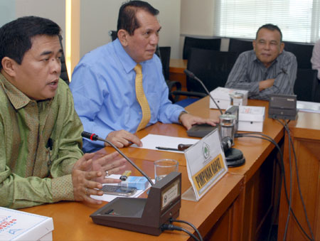 RMOL.Sekretaris Fraksi Partai Golkar DPR, Ade Komarudin (kiri) didampingi Ketua Komisi II DPR Chairuman Harahap menerima Bupati Morowali yang mengusulkan pemekaran Kabupaten Morowali Utara di Gedung DPR, Jakarta, (Selasa 14/6). PATRA RIZKI SYAHPUTRA/RM