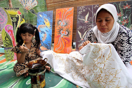 Bertepatan dengan HariBatik Nasional, kemarin seorang Ibu mengajarkan anaknya membatik di kampung Batik Palbatu, Tebet, Jakarta. Warga berharap Pemerintah DKI Jakarta membantu merealisasikan Kampung Batik Palbatu menjadi kampung wisata edukasi. M IQBAL ICHSAN/RM