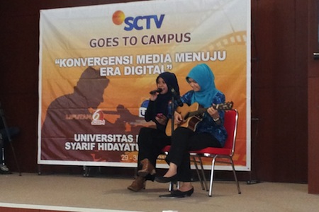 Marwa Fauzia Amri (gitaris) dan Farah Dina Chaliq (vokalis) memperlihatkan kebolehan mereka membawakan lagu pop di ajang SCTV Goes to Campus di Auditorium FISIP Universitas Islam Negeri (UIN) Syarif Hidayatullah di Tangerang Selatan (Kamis, 30/5). Keduanya adalah mahasiswi Jurusan Hubungan Internasional FISIP UIN. Marwa Fauzia Amri pernah memenangkan kompetisi lagu Korea di Seoul, Korea Selatan, dan Farah Dina Choliq telah dua kali meluncurkan album lagu rohani di Hongkong, Republik Rakyat Tiongkok. TEGUH SANTOSA/RMOL