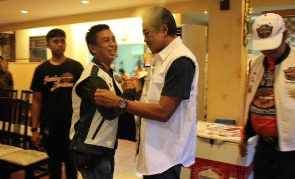 Ketua Umum Harley Davidson Club Indonesia (HDCI) Nanan Sukarna berjabat tangan dengan Kepala Humas dan Dokumentasi HDCI, Muh Rapsel Ali dalam acara berbagi bersama anak-anak panti asuhan di sela-sela buka puasa bersama HDCI di Senayan, Jakarta, kemarin. Selain menyantuni anak yatim, HDCI juga melakukan sejumlah bakti sosial ke beberapa yayasan panti asuhan.