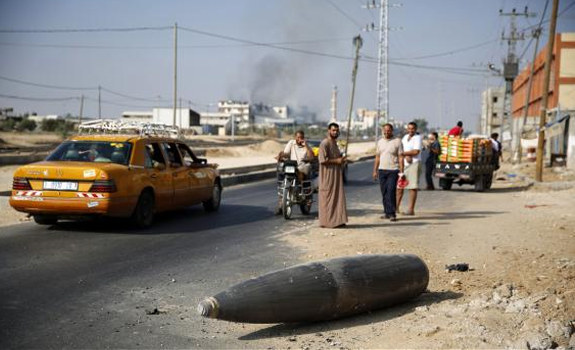 Warga Palestina memandang ke arah rudal Israel yang gagal meledak di pinggir jalan dekat kota Deir Al-Balah yang terletak di pusat kota Gaza pada Jumat (1/8). Diketahui pada hari tersebut rencana gencatan senjata selama 72 jam gagal dilakukan karena baik Israel ataupun Hamas saling tuding memulai kembali serangan. Hingga saat ini, akibat serangan yang dilancarkan sejak awal Juli lalu itu telah lebih dari 1.500 warga Palestina yang tewas. REUTERS
