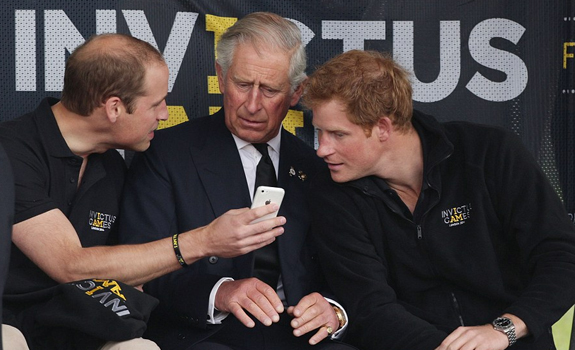 Pangeran William (kiri) tampak memperlihatkan iPhonenya kepada sang ayah, Pangeran Charlie, dan adiknya, Pangeran Harry ketika menyaksikan Invictus Game (Kamis, 11/9). Ketiganya nampak melihat layar iPhone dengan seius sebelum akhirnya tertawa bersama. Tidak jelas apa yang ditunjukkan oleh Williams pada sang ayah dan adiknya tersebut. DAILY MAIL