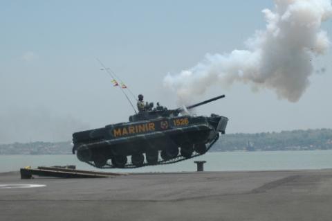 Sebuah Tank Amphibi Korps Marinir TNI AL seakan terbang ketika melakukan lompatan sambil menembakan meriam dari larasnya dalam latihan gladi resik HUT ke 69 TNI di Dermaga Ujung Surabaya Jawa Timur (Sabtu, 4/9). Foto: B Hersunu AW