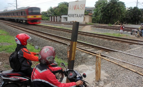 Pengendara sepeda motor memanfaatkan perlintasan kereta api ilegal sebagai jalur alternatif di kawasan Klender, Jakarta Timur, Jumat (27/3). Sudah lebih dari 10 tahun palang pintu rel kereta api tersebut tidak di perhatikan oleh PT. KAI untuk diganti ke Palang pintu otomatis. Hal itu berpotensi membahayakan pengguna jalan yang melintas. Deri Ridwansah/RMTemukan berita-berita hangat terpercaya dari Kantor Berita Politik RMOL di Google News.