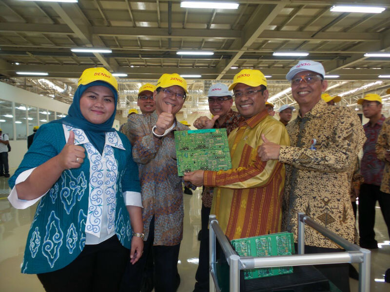 Menteri Perindustrian Saleh Husin (ketiga dari kiri) bersama Bupati Kabupaten Bekasi Hj Neneng Hasanah, Presiden Direktur Toyota Motor Manufacturing Indonesia, Masahiro Nonami dan Direktur Denso Indonesia, A Hartoyo memperlihatkan komponen Electronic Control Unit usai peresmian pabrik ketiga PT Denso Indonesia senilai Rp 1,4 triliun di Bekasi, Jumat (10/4). Temukan berita-berita hangat terpercaya dari Kantor Berita Politik RMOL di Google News.