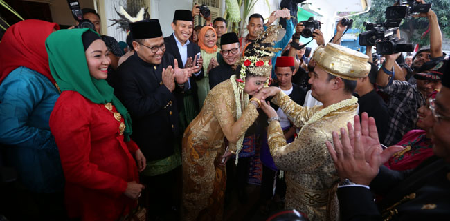 Pasangan nikah massal bertajuk 'PKB Mantu' saat menjalani resepsi nikah di Jakarta, Jumat (25/8). Dalam nikah massal yang diikuti 143 pasangan ini, PKB membantu kebutuhan setiap pasangan mulai dari biaya administrasi, pakaian, mahar, hingga resepsi. Putu Wahyu Rama/RM