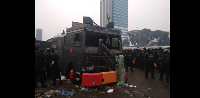 Mobil water cannon milik polisi dirusak pengunjuk rasa di depan Gedung DPR, Jalan Gatot Soebroto, Jakarta, Selasa petang (24/8). Polisi sebelumnya menembakkan air lewat mobil water cannon ke arah mahasiswa yang sedang berdemo. Saat ini, mahasiswa sudah berhamburan ke arah Slipi dan Semanggi setelah polisi menyemprotkan gas air. Ahmad Kiflan Wakik/RMOLTemukan berita-berita hangat terpercaya dari Kantor Berita Politik RMOL di Google News.