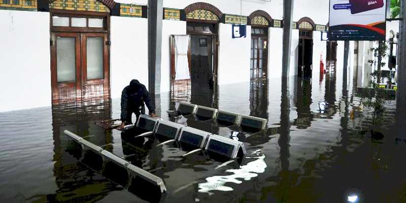 JALUR kereta api di Stasiun Tawang, Kota Semarang, terendam banjir, Kamis (14/3). Hujan lebat yang mengguyur kota itu, beberapa hari terakhir, membuat jalur kereta terendam hingga 20 sentimeter. Bahkan ada bagian peron yang terendam hingga 50 sentimeter. Akibatnya semua perjalanan dari dan ke Semarang, termasuk melintas kota itu, dibatalkan.