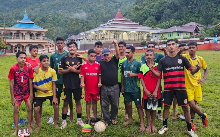 Ketua Umum MSBI Sarman El Hakim (topi) bersama pemain sepak bola junior di lapangan Soninge Gurua, Kelurahan Gurabunga Kecamatan Tidore, Kota Tidore Kepulauan, Maluku Utara. (Foto: RMOL)