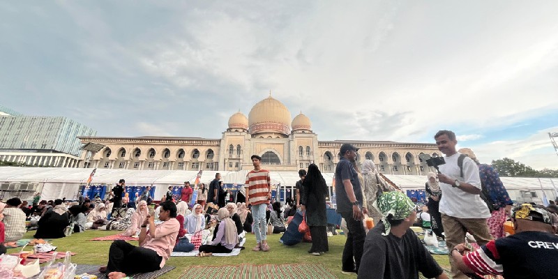 Suasana berbuka puasa bersama di pelataran Perbadanan Putrajaya, Malaysia, Minggu, 1 Maret 2026. Warga duduk lesehan di atas tikar yang dibawa dari rumah, menanti kumandang azan magrib. Tertib dan rapi, mereka menikmati hidangan berbuka dengan latar arsitektur megah kota administratif Putrajaya. (Foto: RMOL/Hani Fatunnisa)