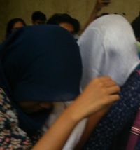 Selain menjaga dengan ketat, para pengawal juga menutupi RW dengan kerudung berwarna putih. Mahasiswi itu hanya menunduk sambil dituntun menuju mobil untuk meninggalkan Polda Metro Jaya.