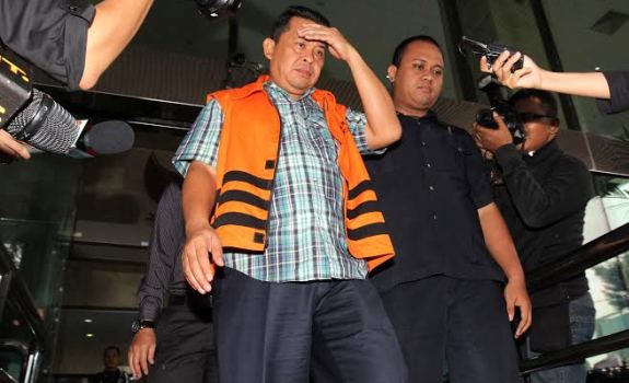 Tersangka tindak pidana korupsi suap terkait penanganan perkara tanah di PN Praya, Nusa Tenggara Barat (NTB) yang juga Kepala Kejaksaan Negeri Subri menutup muka usai diperiksa terkait penanganan dugaan pemalsuan dokumen tanah di Lombok Tengah, di gedung KPK, Jakarta, Selasa (7/1/14). DWI PAMBODO/RM