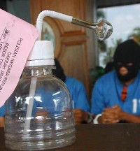 Dadan (40) dan empat orang lainnya hanya bisa menundukan kepala ketika polisi memerintahkannya untuk berdiri di depan Mapolresta Tasikmalaya. Sementara di atas meja, polisi menyimpan barang bukti berupa 1 kg ganja dan delapan paket sabu sabu serta dua alat penghisap sabu yang diamankan dari kelimanya.