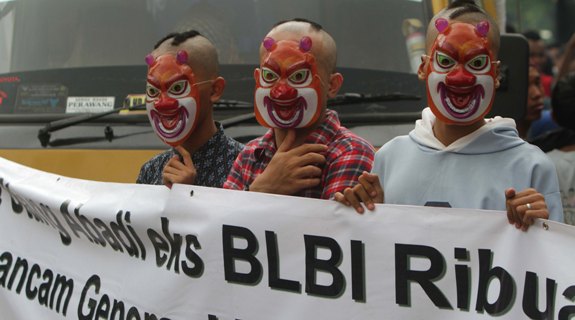 Ratusan orang dari Gerakan Hidupkan Masyarakat Sejahtera berdemonstrasi di depan gedung KPK, Jakarta Selatan, Senin (12/5). Mereka mendesak KPK memeriksa dan menangkap Boediono dan Sri Mulyani Indrawati (SMI) karena diduga terlibat kasus Bantuan Likuiditas Bank Indonesia (BLBI). DWI PAMBUDO/RAKYAT MERDEKA