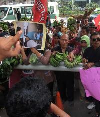 Dalam aksinya di KPK, puluhan petani memboyong hasil pertanian seperti singkong, pisang, dan kacang panjang sebagai tanda prihatin atas dirampasnya sumber nafkah mereka oleh PT Agung Podomoro Land.