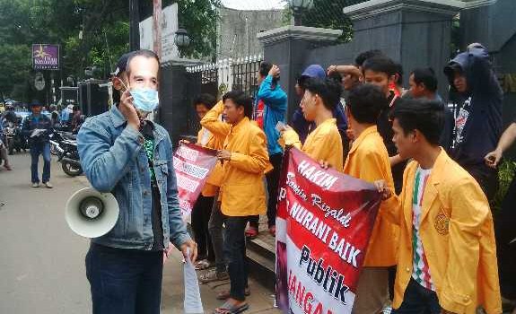"Kami memberi dukungan kepada hakim Sarpin dari tekanan/intervensi dari pihak manapun. Penetapan status tersangka BG jelas ada unsur dendam oleh pimpinan KPK karena tidak bisa menjadi pendamping Presiden Jokowi," teriak Koordinator aksi Bambang saat berorasi dengan mengenakan topeng Abraham Samad dan maskernya.