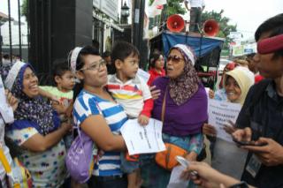 "Kita dari Tanah Tinggi. Pagi-pagi disuruh kumpul dan berangkat kemari (PN Jaksel)," ujar seorang peserta aksi, Pipi, dengan logat betawi sambil menggendong anaknya yang masih balita di depan PN Jaksel, Jakarta, Kamis (12/2).