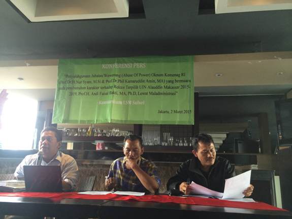 "Ada permaian dari Sekjen dan Dirjen Diktis Kemenag," jelas Ketua Konsorsium LSM Sulsel, Muh. Akmal saat jumpa pers di bilangan Cikini, Jakarta Pusat, Senin (2/3)