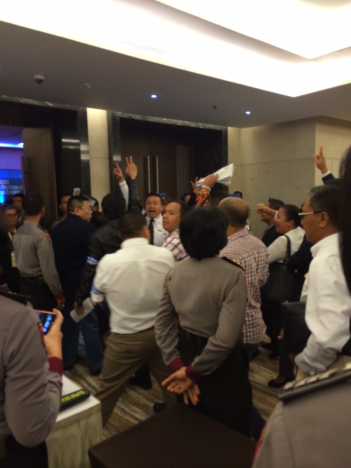 Sementara itu pihak aparat tidak dapat berkutik melihat ratusan advokat memperjuangkan hak-haknya. Para anggota peradi terlihat memenuhi ballroom sambil meneriakan yel yel "Hidup Advokat.. Hidup Peradi, Hidup