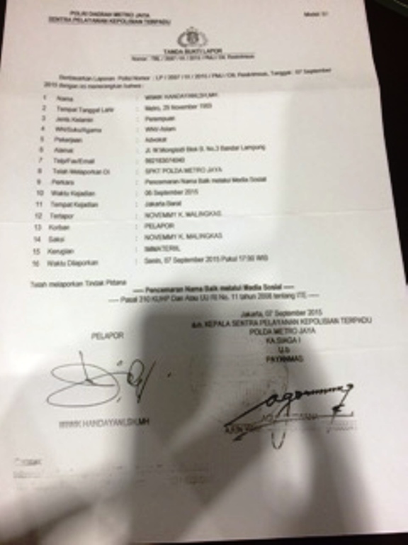 Atas kasus tersebut, menurutnya Wiwik melaporkan Novemi ke Polda Metro Jaya kemarin. Pasal yang dilanggar oleh Novemi adalah pasal 310 KUHP dan atau UU RI No 11 tahun 2008 tentang ITE dengan ancaman hukuman maksimal 1 tahun 4 bulan.