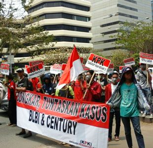 "Kami mendesak KPK mengusut tuntas kasus korupsi Century dan kasus Hambalang, periksa SBY dan Ibas," ujar Koordinator Aksi, Herry Poer dalam orasinya.